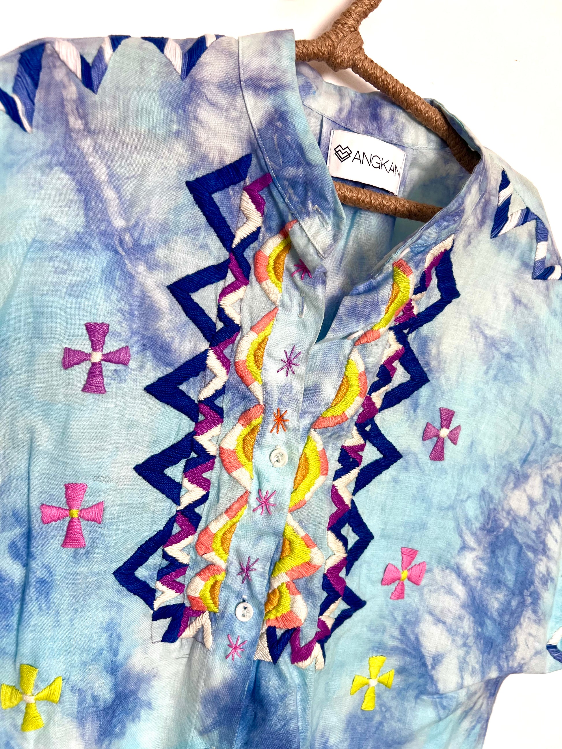 MOIRA is 100% Linen, a fabric with the highest vibration for wellness. Hand-dyed with Philippine indigo in the high Cordillera Mountains. Hand embroidered with Angkan talisman for protection and positive uplifting energy.